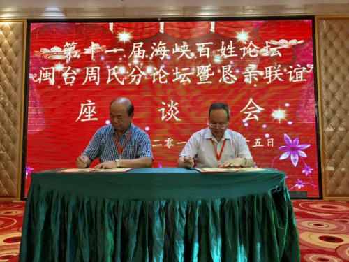 在座谈会上,周玉瑞和周汉章宗亲分别代表闽台周氏在《海峡两岸姓氏文化研究社团长期交流合作协议》上签字。