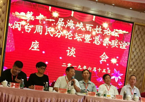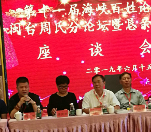 台胞周汉章、周远谋宗亲,福建周钱福、周仪扬、周野、周剑明、周耀红、周达勋、周梅芳(闽周会常务理事、龙岩周氏办事处副会长)、周全喜(德化县周氏联谊会会长、德化县法院原副院长)等宗亲先后在座谈会上发言,台胞周汉章宗亲发言后意犹未尽后面又进行了补充发言。他们的发言虽然角度不一,话语不同,但是都表达出了“两岸同根,闽台一家”的心声。