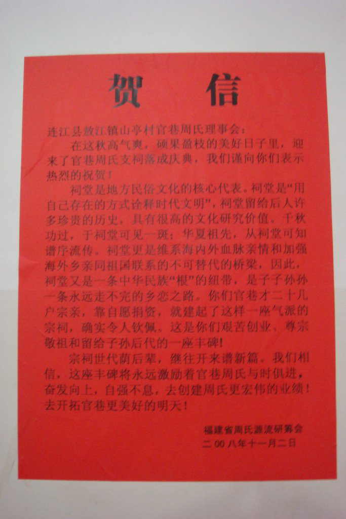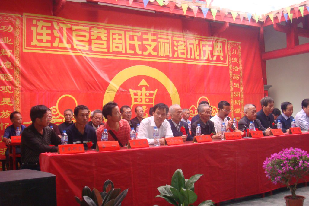 二00八年十一月二日(农历十月初五),连江县敖江镇山亭村官巷披上了节日的盛装,上午官巷周氏在其支祠举行盛大“官巷周氏支祠落成庆典”。参加庆典的有来自宁德市蕉城区周氏联谊会及洋中、六都;长乐市凤庄、凤港、龙塘,闽侯县洋头、江洋、芝田,罗源县香岭;本县义井、首占、花坞、东岱、黄岐、蔗桥、连登、官坞、仙屏口、蝉步等五个县区二十多个村居的宗亲代表,有来自塔头村姻亲、首占、山亭村委会和本村的林氏、柯氏、陈氏、卓氏、阮氏、曾氏、张氏、郑氏、施氏等乡亲代表以及本村族人共二百多人。福建省周氏源流研筹会领导周玉珊、周玉瑞、周伟、周昌舜应邀出席了庆典。