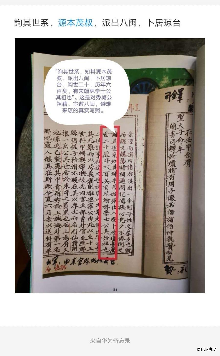 “流派出濂溪,惜遗失未全”。秀梅公与濂溪公分别生长于北宋初未年间,年龄相差约八十,秀梅公因遭建炎之厄而埋名隐居海南琼山县仁政乡宅念都秀梅里。