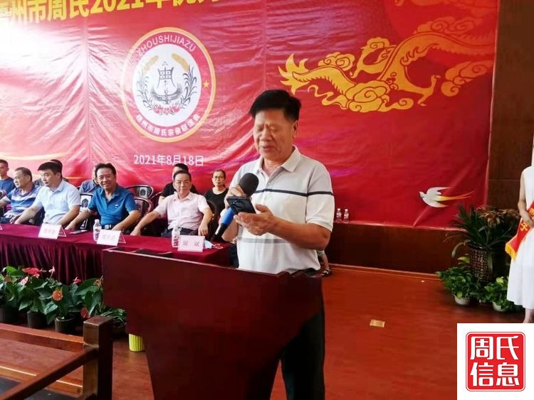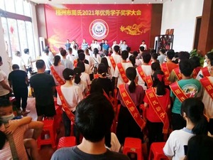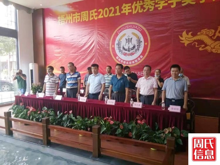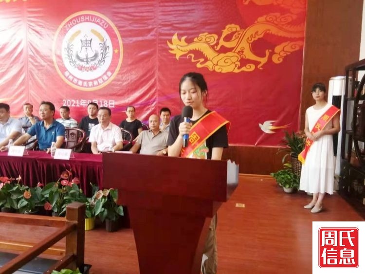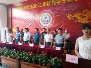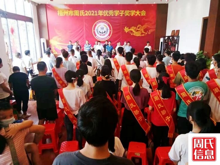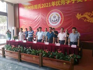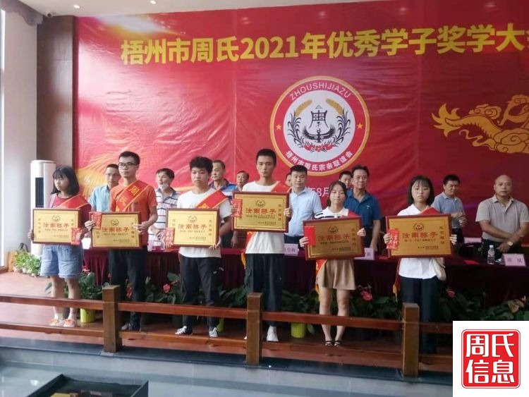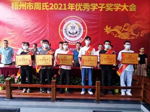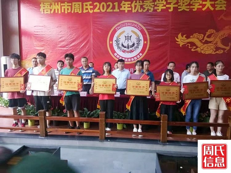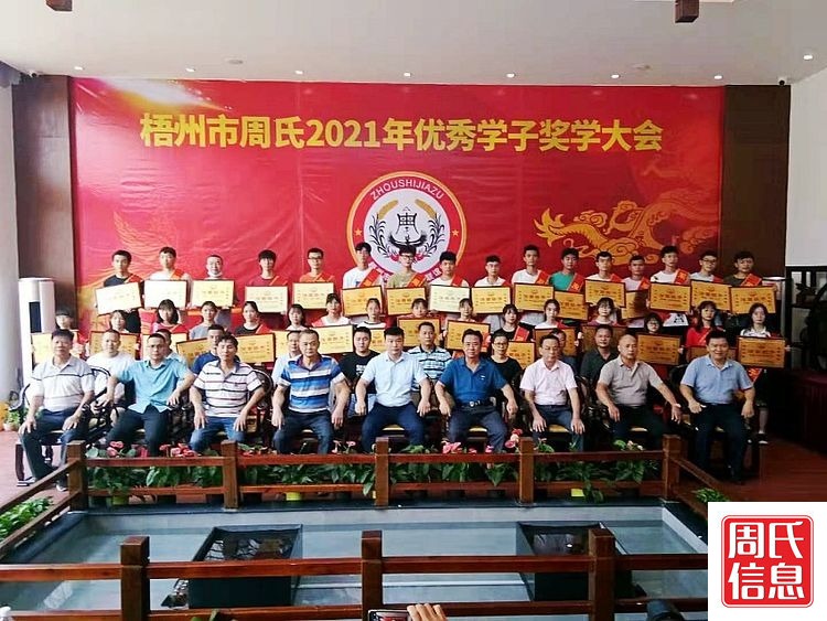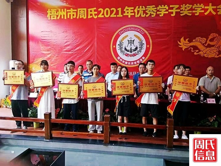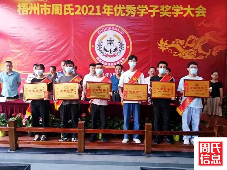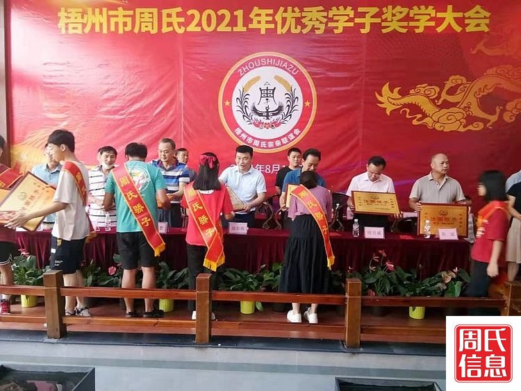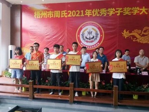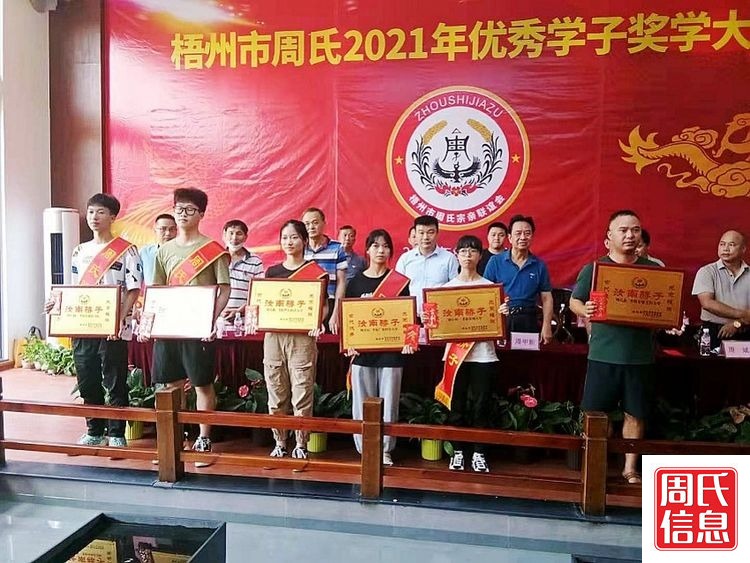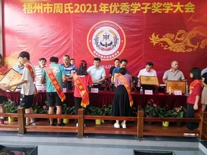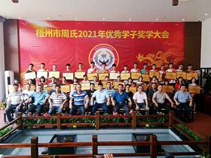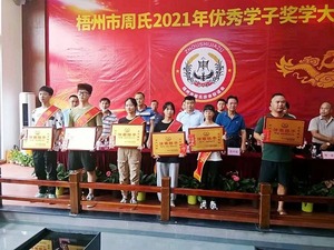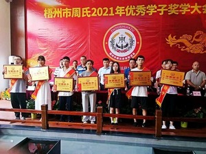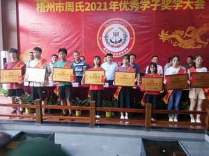 2021年8月18日,2021年度梧州市周氏奖学大会在中和府隆重举行。会上,梧州市周氏宗亲联谊会对今年考上大学的周贵霞、周金满、周明锦等35名获奖的周氏优秀杰出学子进行了隆重表彰。梧州市周氏宗亲联谊会会长周忠海、名誉会长周甲新、获奖学生代表周弋琳先后作了发言。